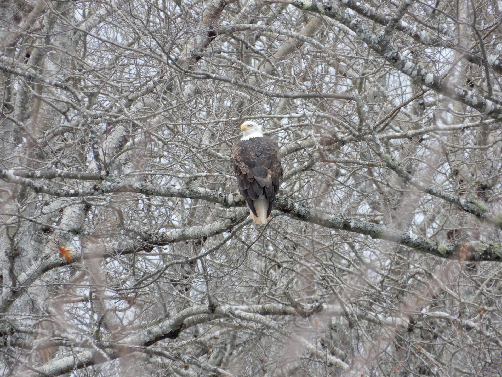 There are tons of bald eagles that roost further up the mountain. They circle far above in good weather, using their innate great telescopic eyesight to locate prey. This species, while still a bald eagle, is considerably smaller than those found in BC on the left coast. I had the ole Cannon P&S stretched out to its full 40X optical zoom, leaning against the door pillar as a steady rest.